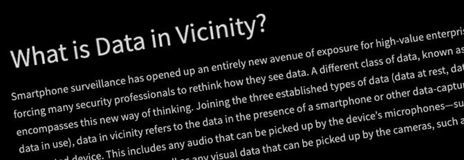 Smartphone surveillance has opened up an entirely new avenue of exposure for high-value enterprise information, forcing many security professionals to rethink how they see data. A different class of data, known as data in vicinity, encompasses this new way of thinking. Joining the three established types of data (data at rest, data in transit and data in use), data in vicinity refers to the data in the presence of a smartphone or other data-capturing, internet-connected device. This includes any audio that can be picked up by the device’s microphones—such as conversations and environmental noise—as well as any visual data that can be picked up by the cameras, such as images of people and spaces.